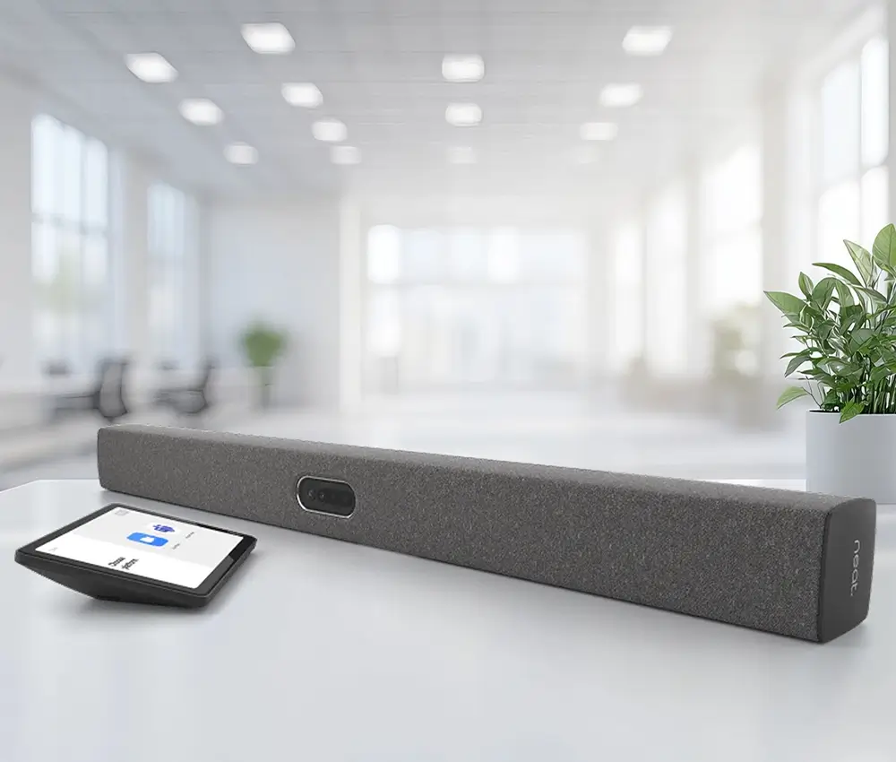 The Neat Bar is a compact, all-in-one video conferencing solution designed for small to medium-sized meeting rooms. Its 4K wide-angle camera provides sharp, high-quality video with features like automatic framing and speaker tracking to ensure all participants are captured effectively. The Neat Bar’s audio system includes powerful built-in speakers and a microphone array with advanced noise suppression and echo cancellation for clear communication. With wireless content sharing and dual-screen support, it’s perfect for collaborative workspaces. Seamlessly compatible with platforms like Zoom and Microsoft Teams, the Neat Bar offers an intuitive and professional video conferencing experience in a sleek and space-saving design.